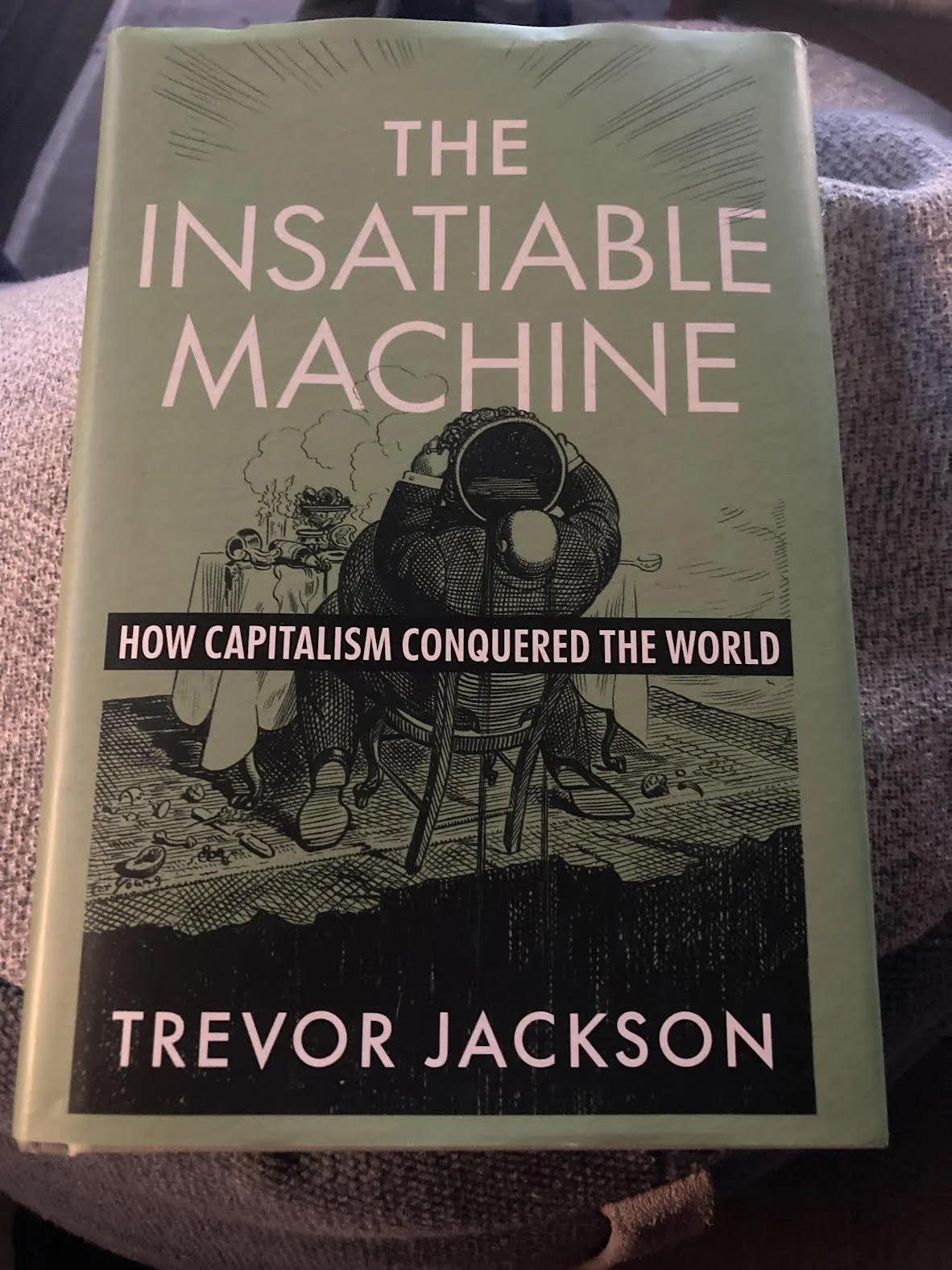 Lowell said he sees zombie capitalism as destined to fail. There was a green book cover from the 19th century. It features a bourgeois factory owner and how unsustainable the economic model is ultimately.